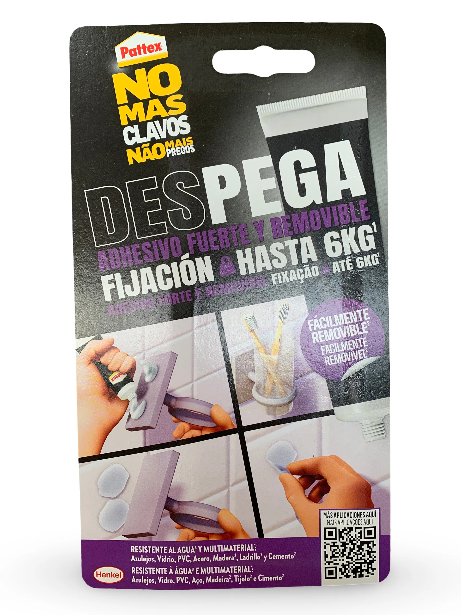El Pattex No Más Clavos DesPega 44 g es un adhesivo de montaje diseñado para ofrecer una fijación resistente y segura, con la ventaja de poder desmontarse fácilmente cuando se necesite. Su fórmula especial permite pegar objetos con gran firmeza sobre superficies no porosas —como azulejos, vidrio, metal o aluminio— asegurando una adhesión limpia y sin necesidad de taladros.